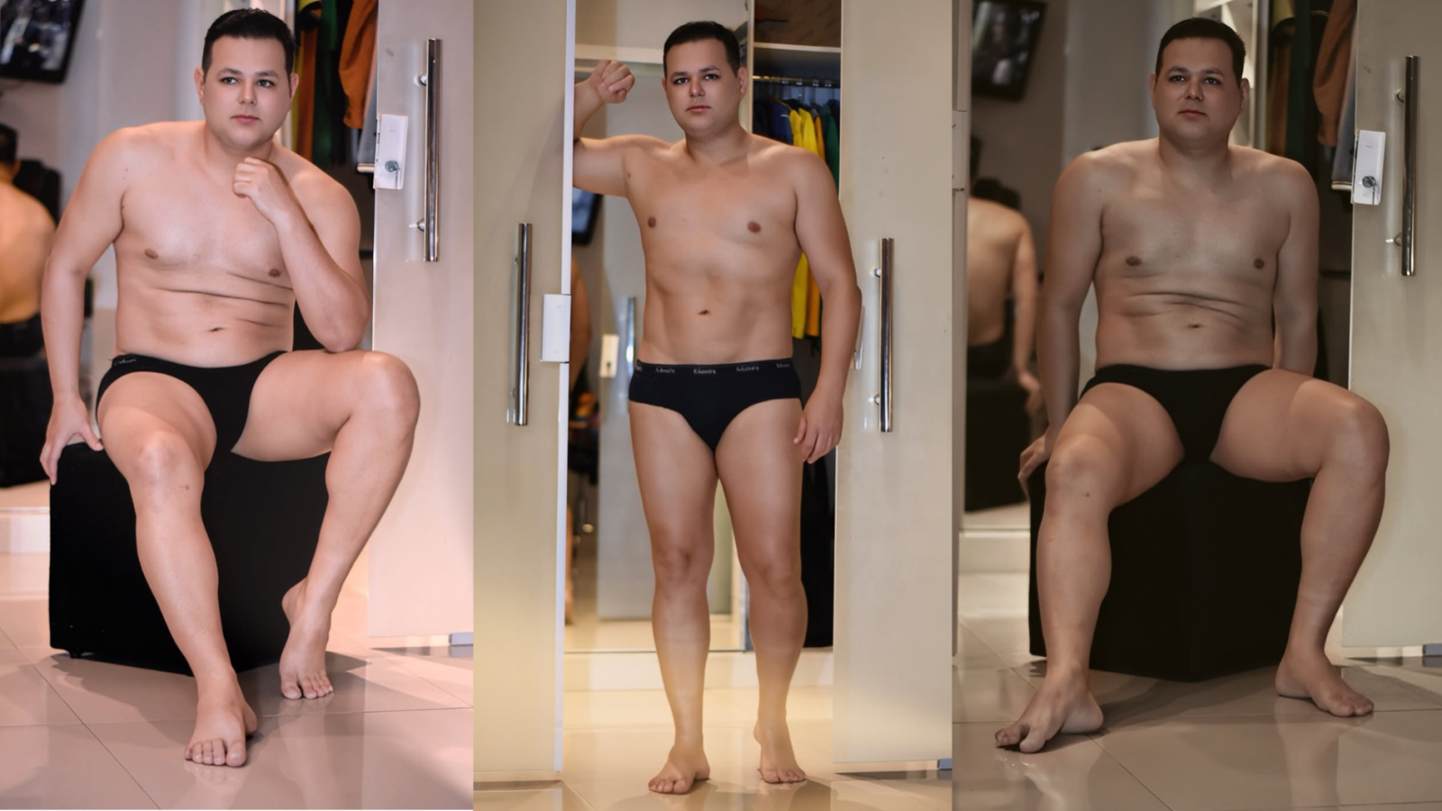 Nas últimas três imagens do carrossel de fotos, Divino posa apenas de cueca.